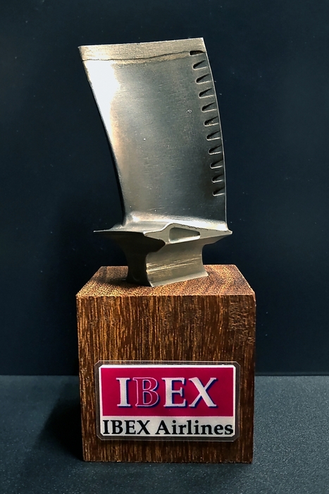 今回販売するのは、現在運航中のCRJ700Next Genに搭載されたエンジン(CF34-8C5B1型)で実際に使用したエンジンブレード(CRJ700 CF34-8C5B1 Engine High Pressure Turbine #2 Stage Rotor Blade)。この部品は、円盤状のディスクに取りつけられ、燃焼された空気を受けることで、エンジンを回転させる役割をもちます。エンジンブレードの中でも最も過酷な環境下にあり、高温・高圧の空気を耐え抜くためニッケル合金で鋳造されています。皆様にご自宅等でお楽しみいただけるようIBEX整備士有志が心を込めて加工いたしました。4月7日(木)12:00~販売価格30,000円(税込)にて、限定5個販売します。