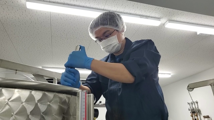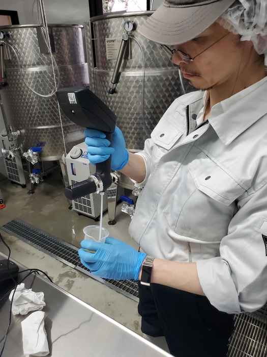 あとは発酵タンクの中の酵母たちに頑張ってもらいます。その間に我々ができることは「発酵管理」といって、毎日もろみをサンプリングし、いろいろ測定すること。順調にいけば約4~8週間ぐらいで目指すミードになってくれるはずです。