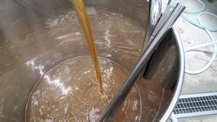 ①お湯と蜂蜜を混合し、蜂蜜酒の元となる液体(マストといいます)を作ります。蜂蜜はお湯と溶けやすいようにあらかじめ低温で温めているので、24kgの蜂蜜が入った熱い一斗缶を持つのはなかなかの重労働。これを何度も繰り返し、蜂蜜とお湯を混ぜていきます。