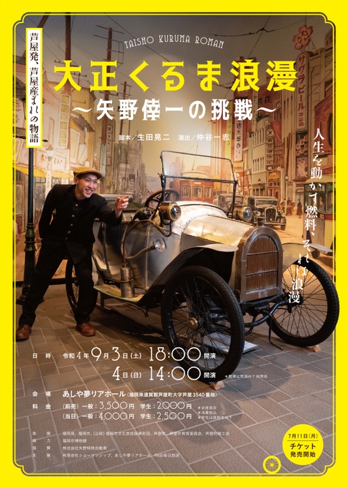 有限会社ショーマンシップ、あしや夢リアホール、RKB毎日放送主催、『大正くるま浪漫~矢野倖一の挑戦~』が2022年9月3日 (土) ~2022年9月4日 (日)にあしや夢リアホール(福岡県遠賀郡芦屋町芦屋3540)にて上演されます。