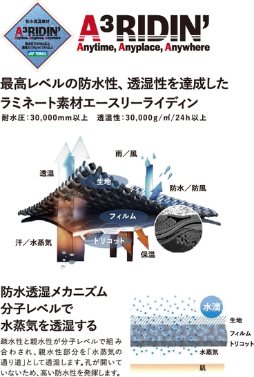 最高レベルの防水性・透湿性でウェア内を快適に保つラミネート素材「エースリーライディン」