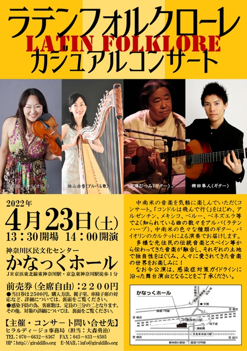 ヒラルディージョ事務局(神奈川県横浜市)主催、『ラテンフォルクローレ・カジュアルコンサート』が2022年4月23日 (土)に横浜市神奈川区民文化センター かなっくホール(神奈川県横浜市)にて開催されます。チケットはカンフェティ(運営:ロングランプランニング株式会社、東京都新宿区、代表取締役:榑松 大剛)にて発売中です。