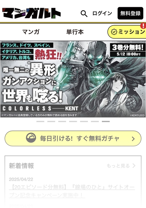 用意された様々な「ミッション」をクリアすることで、対象のマンガを1話分すぐに無料で読める「すぐ無料チケット」が手に入ります。楽しみながらミッションをこなすことで、よりお得にマンガライフを満喫できます。毎日チャレンジできる「すぐ無料ガチャ」も搭載