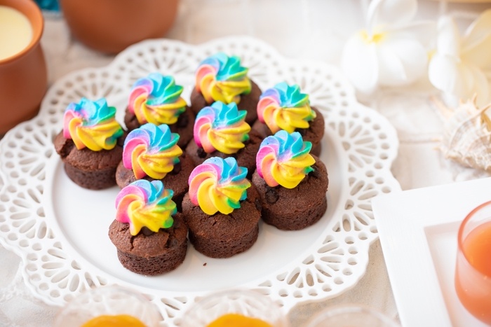 アサイーボウル(お一人様につき1皿) / ハワイアンパンケーキ 5種のシロップ(リリコイバター・グァバ・マカダミア・ベリー・ハニー)/ パイナップルムース / ココナッツムース / ベイクドチーズケーキ / レインボーシフォンケーキ / パイナップルクッキー(プレーン・ココア)/ ココナッツ・レモンタルト / マンゴーパッションオペラ / ココナッツ&マンゴーヴェリーヌ / パッションパンナコッタ / カラフルチョコチップマフィン / ストロベリームース / カラフルライムジュレ(ブルーハワイ・キウイ・パッションパイン・ストロベリー・ブルーベリーバイオレット)