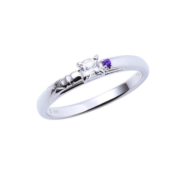 甲丸フォルムのリングにコスチュームの固定ベルトのラインを取り込み、煌びやかなスクエアカットのストーンとアメジストをセット。