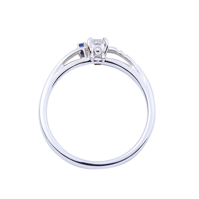 甲丸フォルムのリングにコスチュームの固定ベルトのラインを取り込み、煌びやかなスクエアカットのストーンとサファイヤをセット。