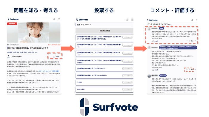 当社が提供するSNS「Surfvote」は社会にあるさまざまな課題を問題提起し、それについて誰もが簡単に意見を投票できるサービスです。Surfvoteでは「イシュー」と呼ばれる各テーマ(課題)に対して複数の選択肢から自分の意見を投票できます。また他のユーザーのコメントを見たり、評価(いいね)したりすることもできます。