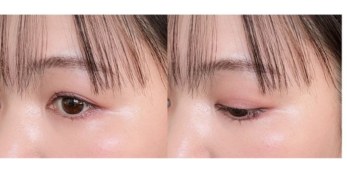 アイメイクは肌なじみの良い淡いピンクで陰影をつけ、立体感を出すのがポイント。淡い色合いをきゅっと引き締めるため、マスカラはブラックをチョイス。