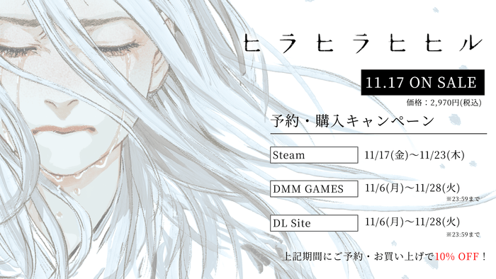 『ヒラヒラヒヒル』は、『Black Sheep Town』など数々のアドベンチャーゲームを手掛けてきた瀬戸口廉也が企画・シナリオを担当。このほか、小説の装画を中心に幅広く活躍するイラストレーターの禅之助、多くのアニメ・ゲームに楽曲提供をしてきたMANYOなど豪華スタッフが集結し、重厚な世界観を彩ります。