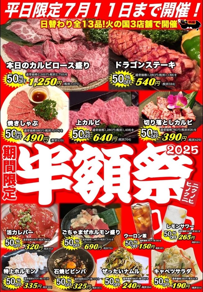 浜松で11店舗の飲食店を展開する株式会社ランドマーク(本社:静岡県浜松市、代表取締役:森 幸太郎)が【七輪炭火焼肉 火の国】3店舗(中田本店、初生店、今之浦店)で、2025年2回目の半額祭を6月11日(水)~7月11日(金)に開催いたします。
