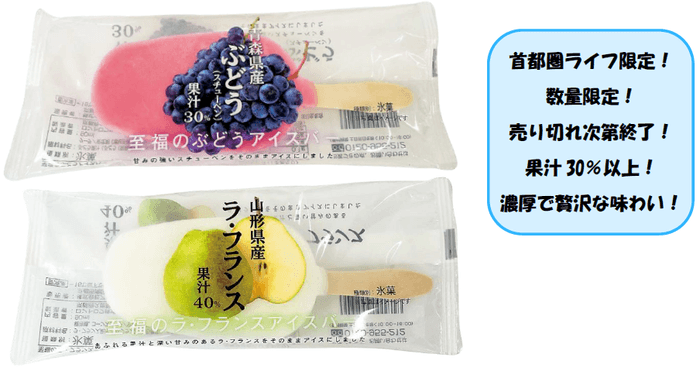 “おいしい” “ワクワク” “ハッピー” をお届けするライフコーポレーションは、”至福のアイスバー第2弾”として「ぶどう」「ラ・フランス」の2種類を首都圏ライフにて8/18(水)に新発売いたしました。