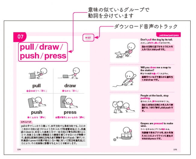 この章では、give とtake などの対立語や、look とsee とwatch など、多くの読者にとって苦手であると思われる「意味の似ている動詞の使い分け」もできるように構成されています。イラストと解説で比べながら理解できるようになっています。例えば、上記のように、「引く」という意味のpull とdraw、「押す」という意味のpush とpress の違いを、コアイメージをつかむ解説文とイラストを通して学んでいきます。