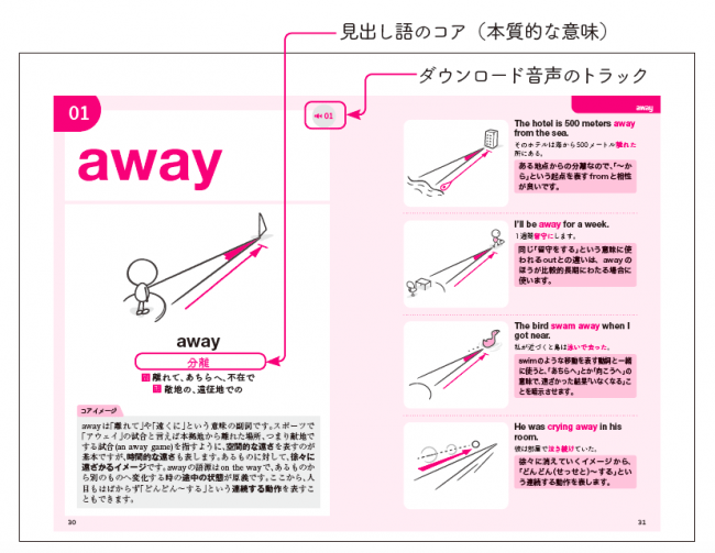 前置詞と副詞の本質的な意味を単純明快な解説とイラストを通して理解します。単語の本質的な意味を「コア(core)」と呼びます。たとえば、away は単に「離れて」という一義的な意味で捉えるのではなく、徐々に遠ざかるイメージや、語源に遡って、on the way「途中に」の意味から「どんどん(せっせと)~する」という連続した動作を表すことなどを学びます。