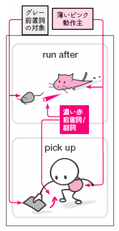 ③ グレー:主に動作を受ける対象(動詞の目的語)や前置詞の対象物などを表しています(すべてではありません)。たとえば、run after では、run(自動詞)の動作主(猫)を薄いピンクで示し、前置詞のafter を濃い赤で、after の対象(ネズミ)をグレーで表しています。