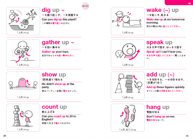 日常会話に絶対欠かせない37 個の「基本動詞」を厳選し、17 のセクションに分けています。ここではgo =「行く」、come =「来る」といった一語一義的な訳ではなく、解説と例文、さらにイラストを通して動詞のコアに迫っていきます。そして、そのコアイメージを第1章で学んだ前置詞・副詞のイメージと結び付けながら英熟語を一気に学びます。
