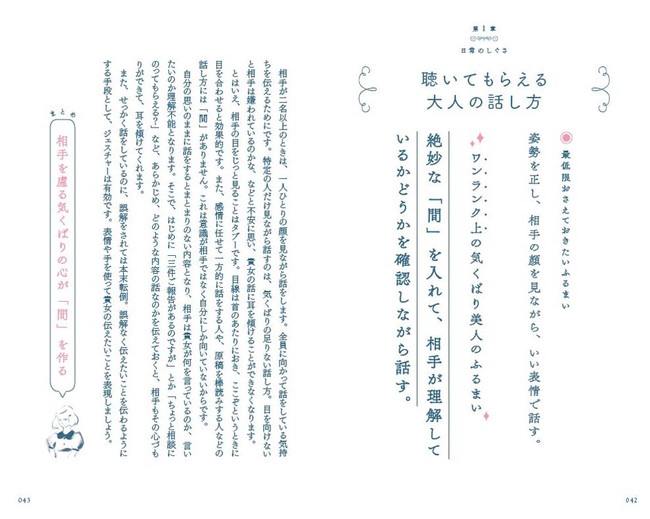 本書では、各章で「日常のしぐさ」、「訪問、招待時のふるまい」、「食事のお作法」、「人付き合いの心得」、「お便り、SNSコミュニケーションの心得」といった“ひとつ上のマナー”はもちろんのこと、マインドの部分である「基本の心構え」をお伝えします。