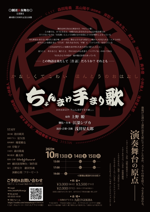 劇団演奏舞台 劇団創立50周年記念公演III ・公演81『ちょんまげ手まり歌』が2023年10月13日 (金) ~10月15日 (日)に演奏舞台アトリエ/九段下GEKIBA(東京都千代田区)にて上演されます。