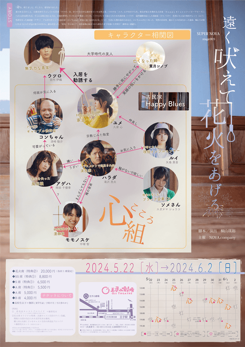 SUPERNOVA『遠く吠えて花火をあげる』が2024年5月22日 (水) 〜 2024年6月2日 (日)に王子小劇場(東京都北区王子 1丁目14-4 B1F)にて上演されます。この度、キャラクタービジュアルと相関図が解禁となりました。