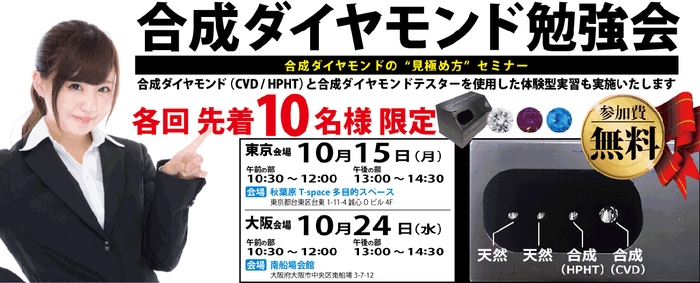 リサイクル店向けの宝石買取査定システム「宝石システム」を運営している株式会社リユース(本社:福岡県福岡市、代表取締役:田中 しんや)は、宝石総合科学研究所(本社:福岡県福岡市、所長:藤森 祥平)と共同で合成ダイヤモンドの“見極め方”を分かりやすく解説する『合成ダイヤモンドの“見極め方”セミナー』を、2018年10月15日(月)に東京、10月24日(水)に大阪で開催いたします。