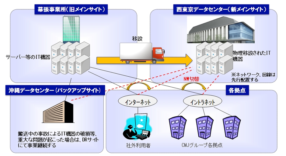 キヤノンマーケティングジャパン株式会社(代表取締役社長:川崎正己、以下キヤノンMJ)は、このほどキヤノンMJグループ基幹システムのメインサイトを、幕張事業所から西東京データセンターに移転しました。これにより、遠隔地バックアップとして沖縄データセンターで運用しているDR(ディザスタリカバリ)サイトと合わせ、強固なBCP(事業継続計画)型システム運用体制を構築しました。