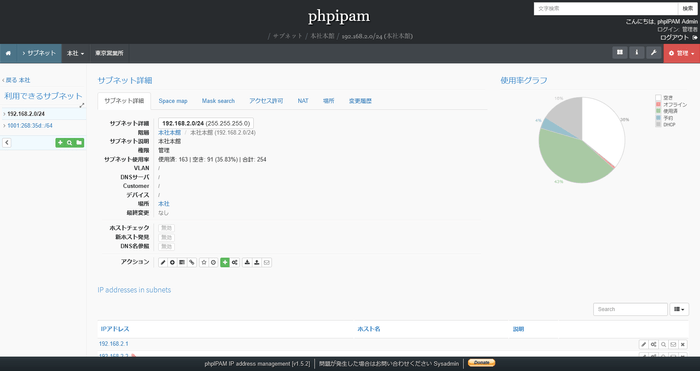 『phpIPAM』では、登録したIPアドレスを一覧やグラフで表示することができます。そのため、既存の機器のIPアドレスを調べる、新しく導入する機器にIPアドレスを割り当てるといったIPアドレス管理業務を効率的に行うことができます。