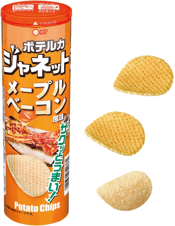 「ジャネットメープルベーコン風味」は、網目状の加工を施した厚みのあるポテト生地に、メープルシュガーのコクのある甘さと、旨味豊かなベーコンの塩味を組み合わせました。ザクッとした堅めの食感とポテトの風味に、メープルベーコンの甘じょっぱい後引く味わいをお楽しみいただけます。