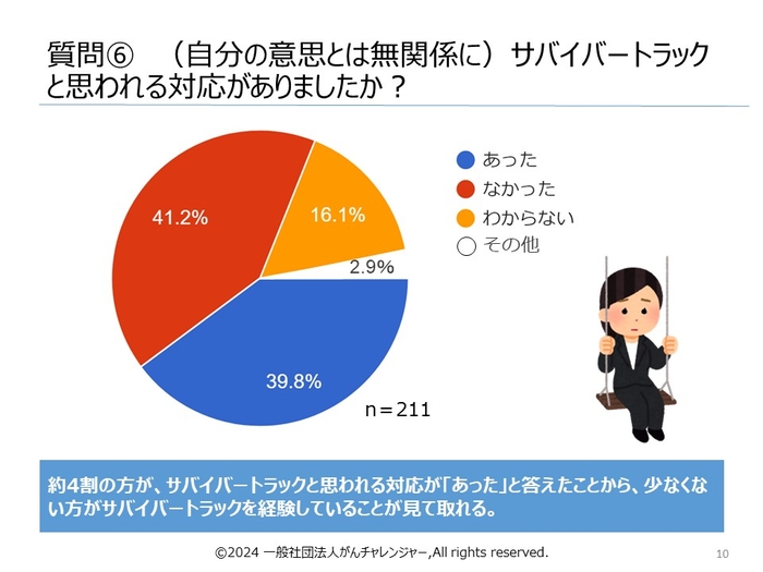 一般社団法人がんチャレンジャー(所在地:千葉県柏市、代表理事:花木裕介)は、この度、がん罹患経験者の皆様のご協力により、「サバイバートラック」に関するアンケートを実施し、その調査結果の無料公開を始めました。(調査期間:2024年4月1日(月)~5月19日(日))
