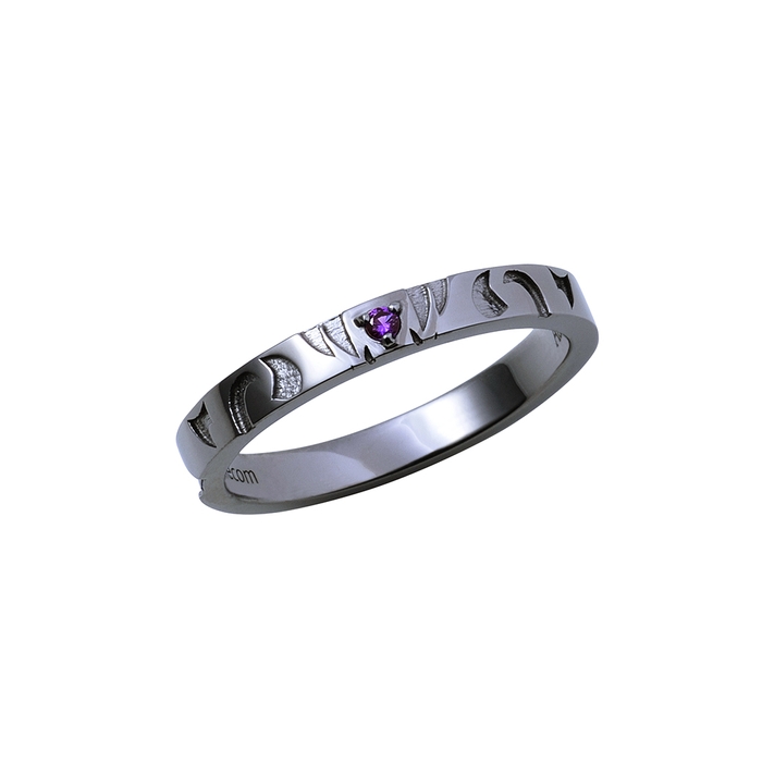 ストレートタイプのリングに陣営マークの柄を取り込み、イメージカラーストーンをセット。リング内側にはキャラクターの名前を英字で刻印しました。
