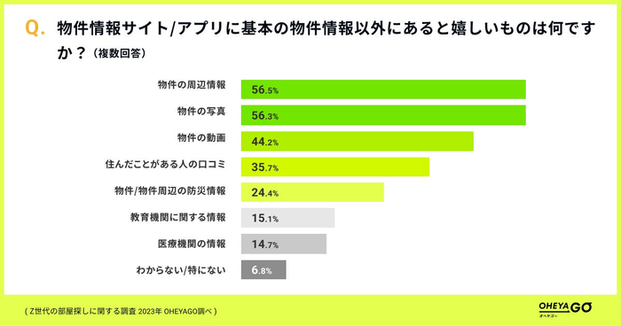 物件情報サイト/アプリに基本の物件情報以外にあると嬉しいものを質問したところ、「物件の周辺情報」と「物件写真」が約57%で最多に。3位に「物件の動画」となりました。