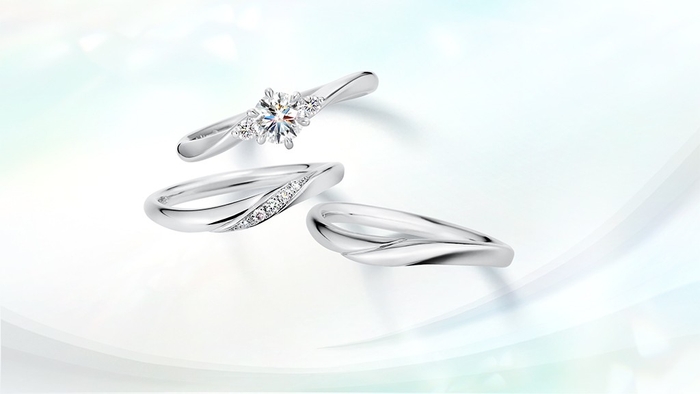 このほどの新作ブライダルリングは、“心地よく流れる時間を、大切なあなたとともに…”をコンセプトに、指のつけ根に馴染むやわらかな曲線美を表現しました。婚約指輪は、センターダイヤモンドに寄り添うように、2石のダイヤモンドをセッティングしています。結婚指輪は、3つの面があるウェーブラインのリングで、プレーン、メレダイヤモンド5ピース、17ピースなど留め方をアレンジできるデザインです。