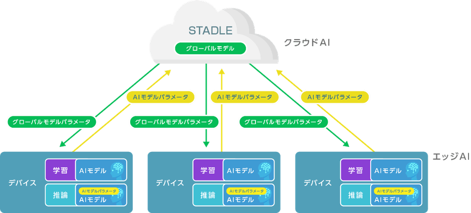 STADLE™は、エッジAI側の生データを共有することなく、エッジAIのモデルを学習させることができます。具体的には、エッジAI側のローカルAIモデルのパラメータのみを集め、クラウドAI側でそれらを統合したグローバルモデルを生成し、それらをエッジAI側に返すことで、エッジAIの学習を推進することが可能です。生データを共有しないため、従来のコンピューティングリソースやネットワークリソースの圧迫や処理遅延の問題を解消することができます。