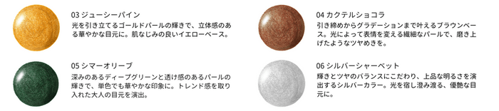 それぞれのカラーに合わせてパールの大きさを変え、最も魅力的に見える組合わせを追求いたしました。肌に溶け込むのに上品な存在感があり、やわらかい輝きで目元に透明感を与えます。