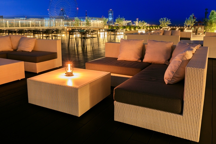 夜景はもちろん、お料理への移動もスムーズ!!人気のパラソル席で素敵なお時間をお過ごしください。