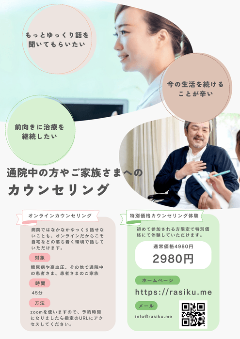 株式会社rasikuでは通院中の方や患者様のご家族を対象とし、期間限定で看護師によるオンラインカウンセリングを特別価格で提供いたします。