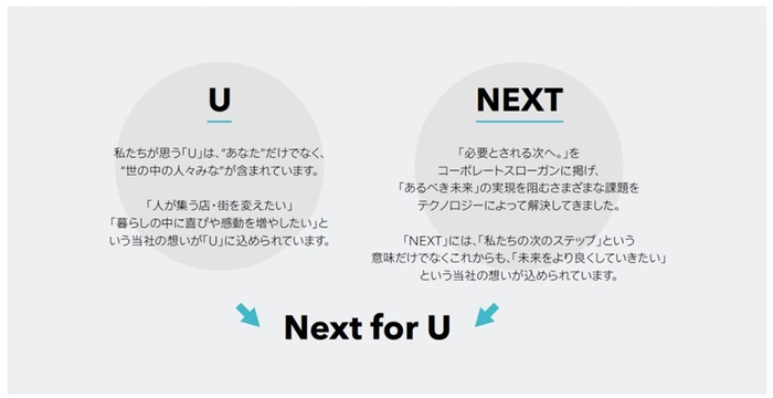 「NEXT」という言葉には、「私たちの次のステップ」という意味だけでなくこれからも、「未来をより良くしていきたい」という当社の想いが込められています。また、私たちが思う「U」には、“あなた”だけでなく“世の中の人々みな”が含まれています。「人が集う店・街を変えたい」「暮らしの中に喜びや感動を増やしたい」という当社の想いが「U」に込められてます。