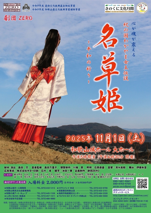 劇団ZERO公演 紀の国わかやま女王伝説「名草姫~平和の祈り~」が2025年11月1日 (土)に和歌山城ホール 大ホール(和歌山県和歌山市七番丁25番1)にて上演されます。