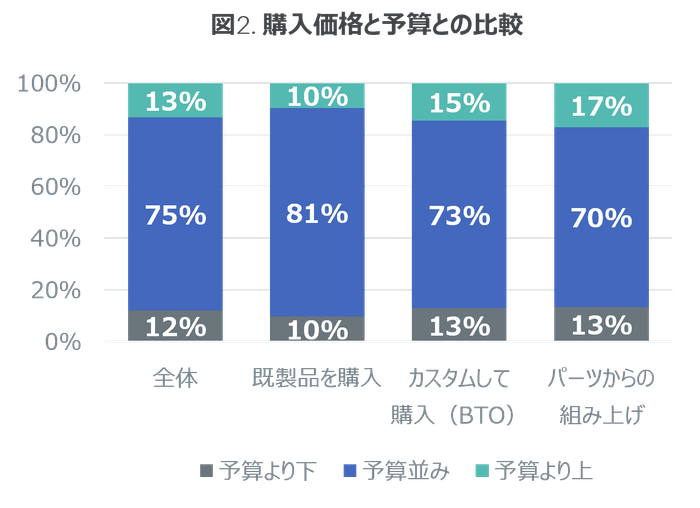 購入価格(パーツから組み上げた場合はその総額)と予算との比較では、ユーザー全体の75%が予算並みで購入しているものの、BTOのゲーミングパソコンやパーツからの組み上げは、予算より上での購入になった割合が全体より高かった(図2)。求めるスペックを実現するためパーツをカスタマイズしている分、高額になったとみられる。特にBTOパソコンは購入価格が高く、20万円以上での購入が半数を占めた。