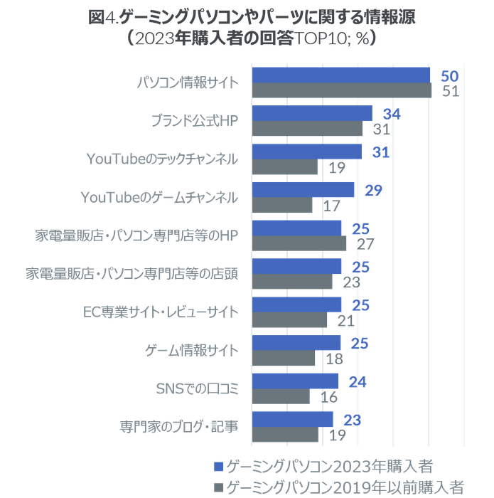 ・ゲーミングパソコンやパーツに関する情報を得る場所として、YouTubeの利用が4年前から大幅に増加した。