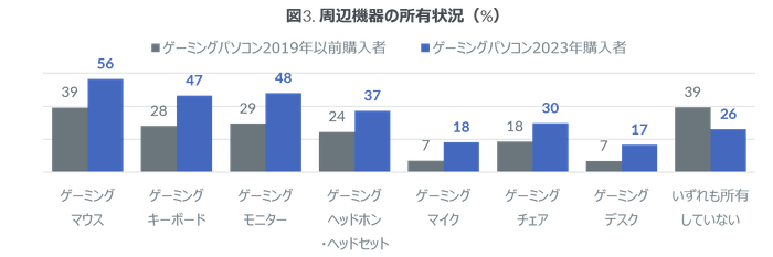 ・ユーザーの半数近くがゲーミングマウス、モニター、キーボードなどの周辺機器を所有している。