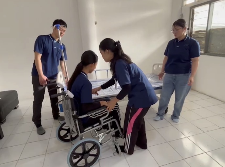 本研修は2026年2月20日・21日の2日間、LPK MOMOTARO NIHONGO GAKKOU研修ルームにて実施されました。研修では介護用ベッドや車椅子等の介護機器を設置し、日本の介護現場に近い環境を再現した実践型トレーニングが行われました。