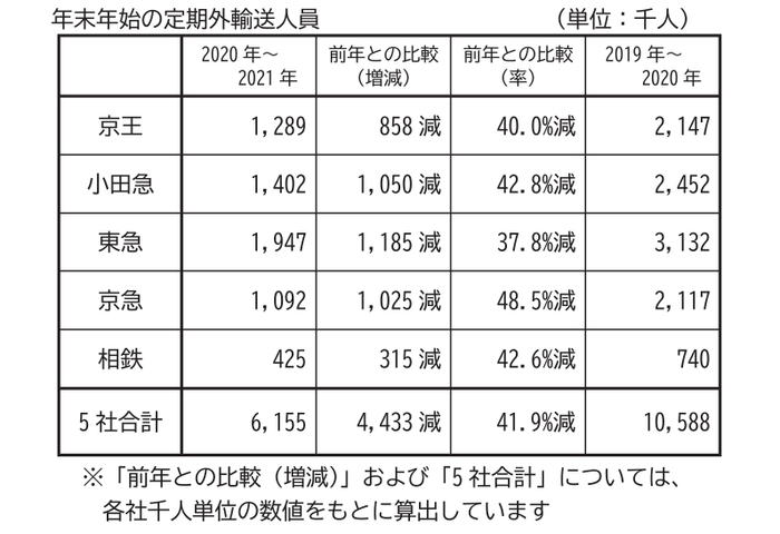 年末年始の定期外輸送人員は前年より41.9%減少【神奈川県内大手民鉄5社】