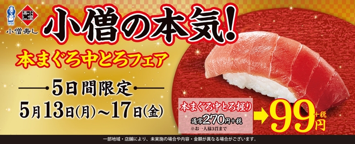 株式会社小僧寿し(東京都中央区、代表取締役・小林剛)は、5/13(月)~5/17(金)の5日間、小僧の本気!本まぐろ中とろフェアを開催致します。