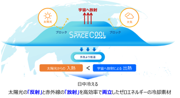 直射日光下において、太陽光と大気からの熱をブロックし熱吸収を抑えるだけではなく、放射冷却技術の原理により、宇宙に熱を逃がすことで、エネルギーを用いずに外気温よりも温度低下する放射冷却素材です。