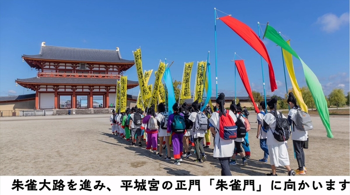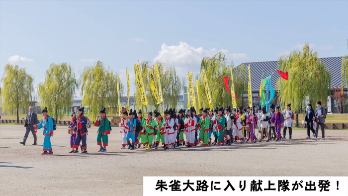 奈良文化財研究所では、出土遺物に因んだ地域間交流として、奈文研職員が天平人に扮して赤米を受け取るとともに、木簡や平城宮跡について解説をおこなっています。