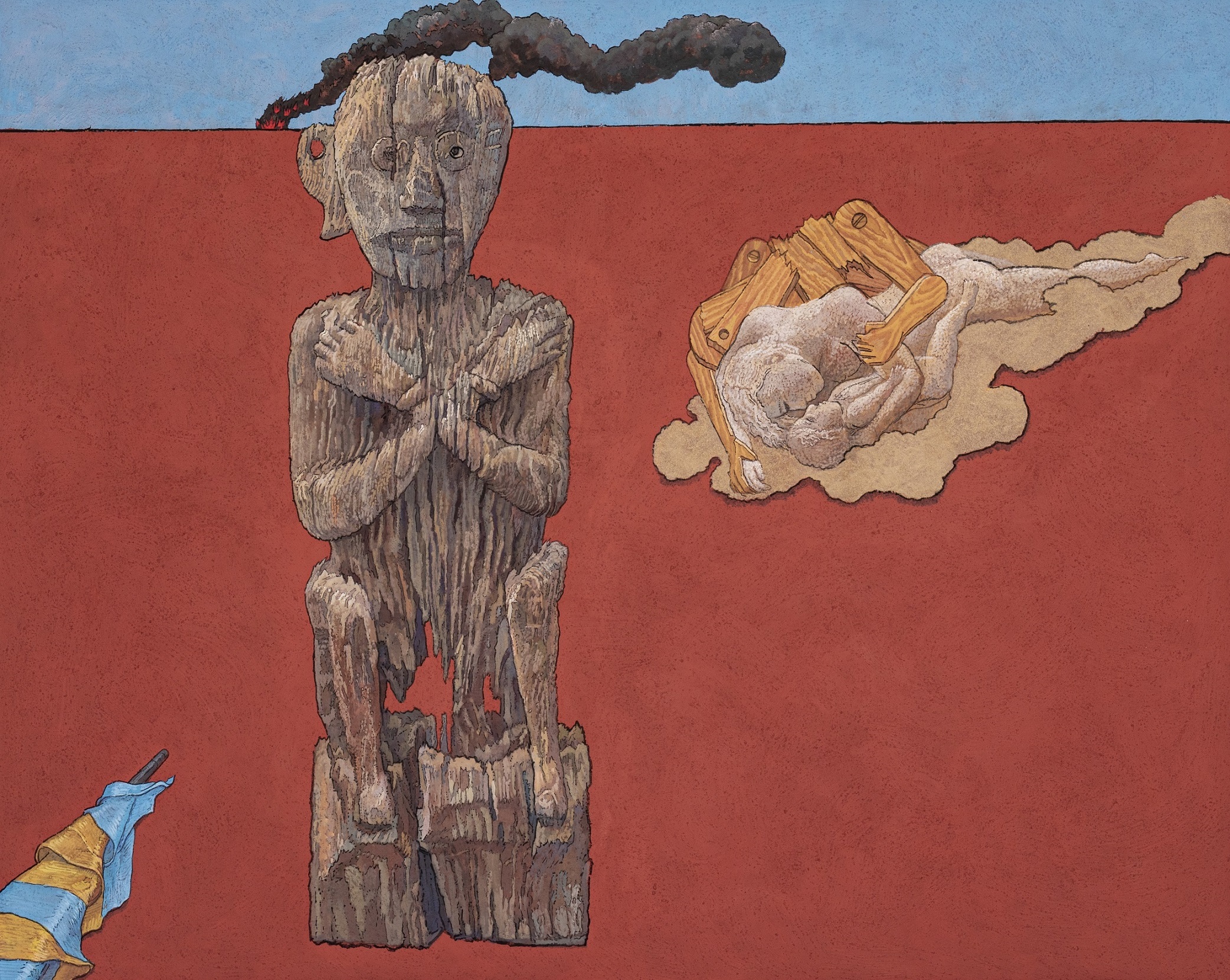 鎮魂と呪術性漂う異形の古代木像は、時と共に万物が朽ち行く無常観を暗示し、その背後には砂中に伏せる母子と、覆いかぶさる木偶が描かれている。澄んだスカイブルーの空の下、赤い地平線の彼方には黒煙が上がり、画面左下にはウクライナ国旗で包まれた機関銃が覗く。