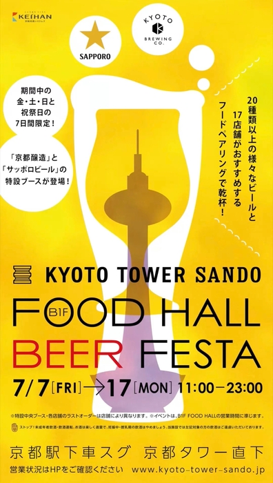 株式会社京阪流通システムズ(本社:大阪市中央区、代表取締役社長:松下靖)が運営する「KYOTO TOWER SANDO(京都タワーサンド)」は、2023年7月7日(金)~17日(月・祝)の11日間、B1Fにて『FOOD HALL BEER FESTA』を開催いたします。『FOOD HALL BEER FESTA』では、FOOD HALL内の各店が提供する20種類以上のビールに加え、期間中の金・土・日・祝祭日の7日間限定で「京都醸造」「サッポロビール」など4ブランドがおすすめする普段はFOOD HALLで味わえない銘柄をお楽しみいただけます。また、京都を味わう食べ歩きをテーマとするFOOD HALLならではのお楽しみとして、ビールと各店おすすめのフードのペアリングにより、より一層お酒を楽しめるイベントとなっております。また、京都タワーサンドのLINE公式アカウントにて『FOOD HALL BEER FESTA 満喫スタンプラリー』を同時開催いたします。期間中、FOOD HALL内の店舗をご利用ごとにLINE公式アカウント上でスタンプを1個ゲット。異なる5つの店舗のスタンプを集めると、FOOD HALL内で使える300円分のグルメチケット(電子)をプレゼントいたします。