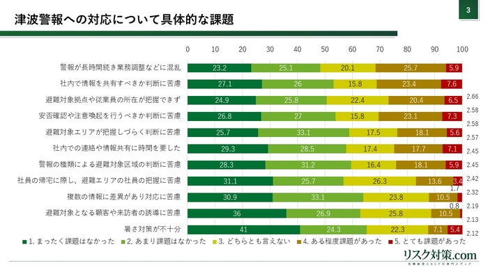 具体的に課題となったことを、各項目ごと5段階で評価してもらったところ、最も課題が大きかったのは「警報が長時間続き業務調整などに混乱」(平均値2.65)で、次いで「社内で情報共有すべきか判断に苦慮」(2.58)、「避難対象拠点や従業員の所在が把握できず」(〃)となりました。