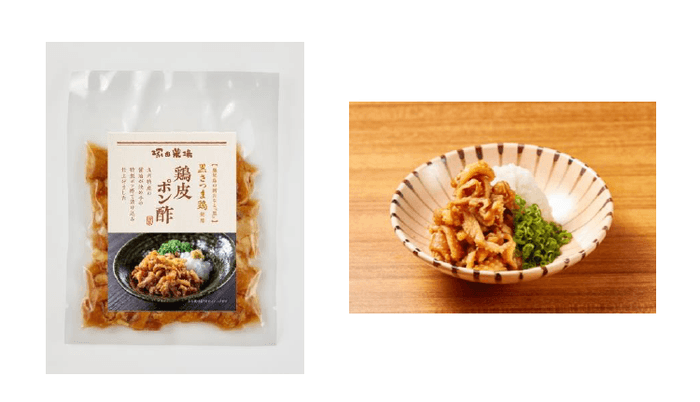 鹿児島県が誇る黒牛・黒豚に続く新たなる黒「黒さつま鶏」の皮を、九州特産の醤油が決め手の特製ポン酢で漬け込み仕上げました。