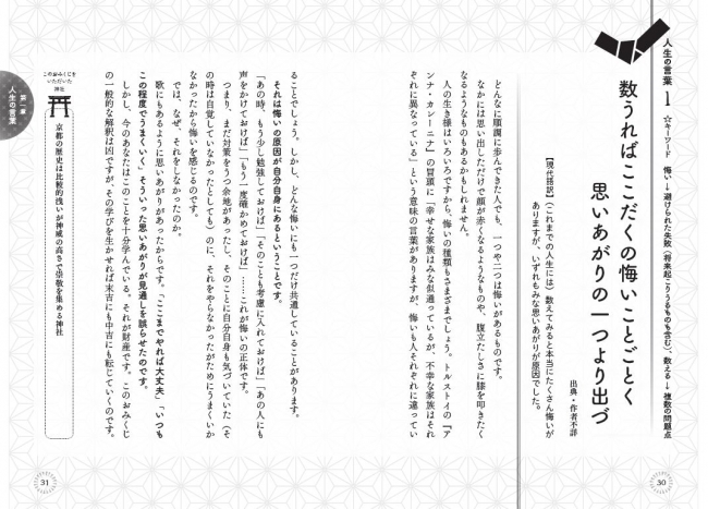 また、読み方だけでなく、「おみくじの成り立ち」「正しいおみくじの引き方、扱い方」、『万葉集』や『古今和歌集』『新古今和歌集』といった和歌集についてなどもコラムで紹介。