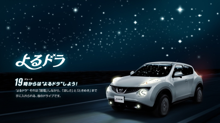 日産が恋愛にも効く究極の節電スタイル「よるドラ」(夜のドライブ)を提案! 節電のため19時~22時は日産ジュークでドライブしよう。